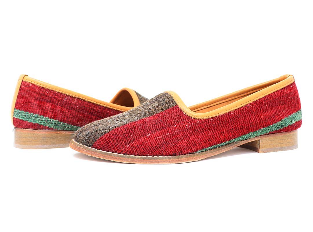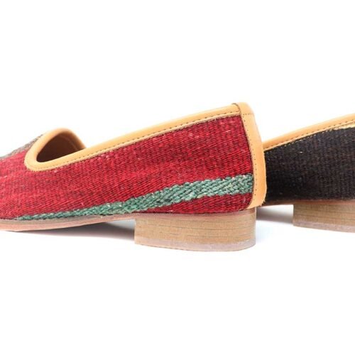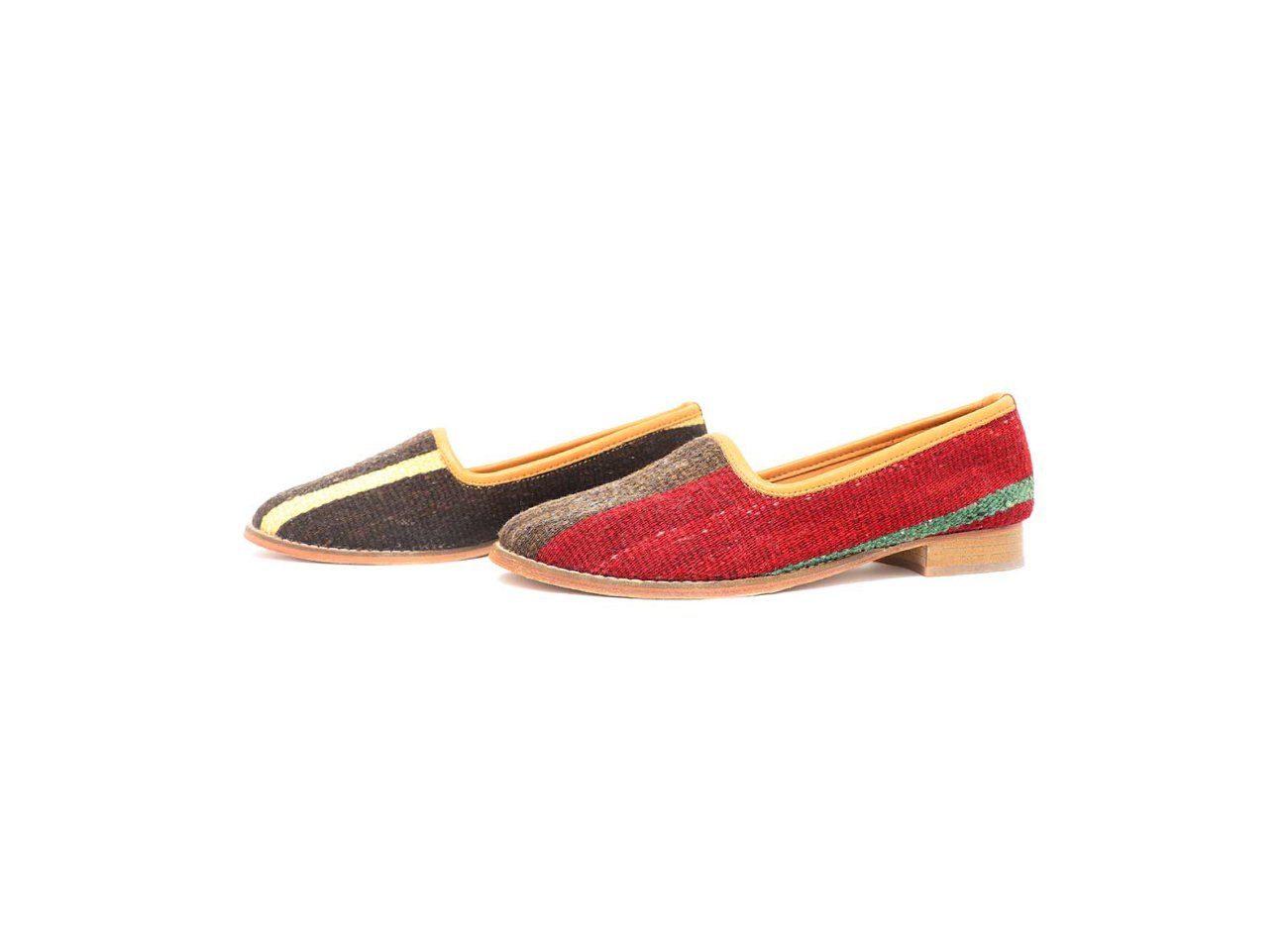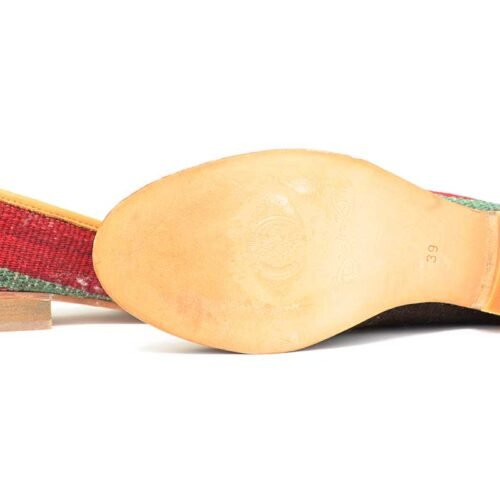 Our kilim shoes are made from semi old woven wool kilim. The slippers are made of leather inside and leather sole, so it will stretch and form to your foot beautifully.