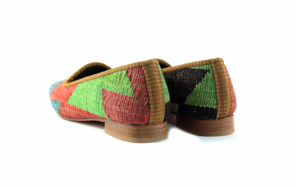 Los zapatos de kilim están hechos a partir de los kilims semi antiguas de Turquía. Están hechas de piel por dentro y suela de cuero. Normalmente cada zapato es diferente y único, es muy poco común encontrar dos zapatos iguales.